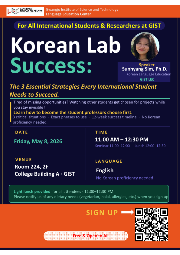 This Workshop is designed specifically for international students and researchers who want to succeed in Korean lab culture.
