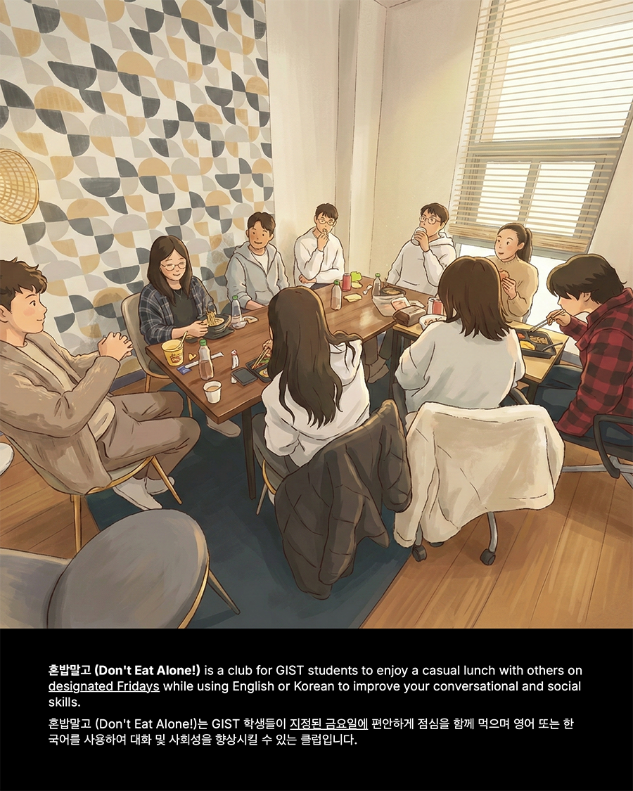 혼밥말고 (Don't Eat Alone!) is a club for GIST students to enjoy a casual lunch with others on designated Fridays while using English or Korean to improve your conversational skills. To see our Friday schedule and to join our lunch, please click on this Google link and remember that seating is limited to 5 people: